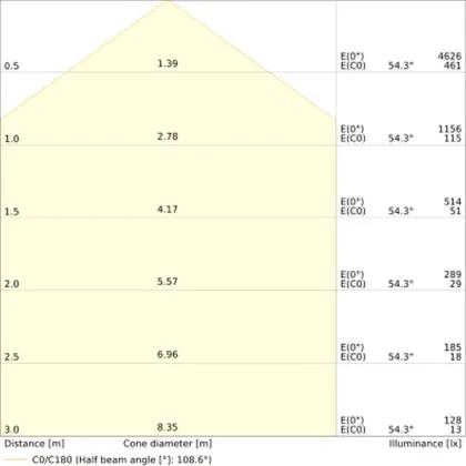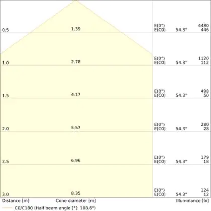 Beispiel: Wird eine Lampe mit einem Abstrahlwinkel von 60 Grad an der Decke (2,5 m Höhe) angebracht, erzeugt sie einen Lichtkegel von 2,9 Metern Durchmesser. Hat die Lampe hingegen einen Abstrahlwinkel von 120 Grad, beträgt der Lichtkegel 8,7 Meter im Durchmesser. |