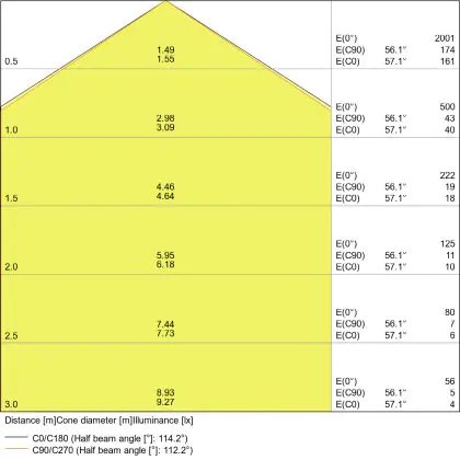 Beispiel: Wird eine Lampe mit einem Abstrahlwinkel von 60 Grad an der Decke (2,5 m Höhe) angebracht, erzeugt sie einen Lichtkegel von 2,9 Metern Durchmesser. Hat die Lampe hingegen einen Abstrahlwinkel von 120 Grad, beträgt der Lichtkegel 8,7 Meter im Durchmesser. |
