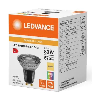 Die Ledvance LED PAR16 GU10 Reflektor 8.3W 575lm 36D - 930 Warmweiß | Höchste Farbwiedergabe - Dimmbar - Ersatz Für 80W ist eine effiziente GU10 LED-Lampe und der perfekte Ersatz für Ihre konventionelle Halogenlampe mit 80W und einem GU10-Sockel, bei welchem die zwei Stifte einen Abstand von 10 mm zueinander haben. Zudem strahlt das Produkt Licht in der Farbtemperatur 3000K - Warmweiß aus und punktet durch eine lange Lebensdauer.