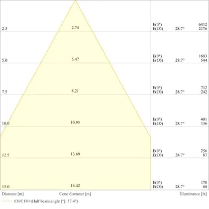 Beispiel: Wird eine Lampe mit einem Abstrahlwinkel von 60 Grad an der Decke (2,5 m Höhe) angebracht, erzeugt sie einen Lichtkegel von 2,9 Metern Durchmesser. Hat die Lampe hingegen einen Abstrahlwinkel von 120 Grad, beträgt der Lichtkegel 8,7 Meter im Durchmesser. |