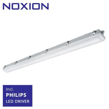 Die LED-Feuchtraumleuchte mit integriertem Philips-LED-Treiber hat eine Länge von 150 cm. Das Noxion-Produkt ersetzt eine herkömmliche Leuchte à 58 Watt. Selbst verbraucht es nur 33 Watt – eine schnelle Amortisation ist damit gewährleistet. Diese LED hat mit einem Wert von 4.000 K eine kaltweiße Farbtemperatur. Sie ist IP66- und IK08-klassifiziert und kann als Notfallbeleuchtung (1 Stunde) eingesetzt werden.