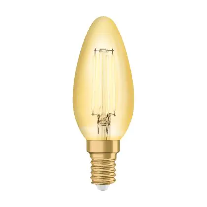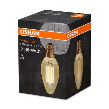 Die Osram Vintage 1906 LED E14 B35 4.5W 825 Gold | Ersetzt 36W ermöglicht enorme Energieeinsparungen von bis zu 90 %. Dank des Standard-E14-Sockels klappt der Umstieg auf LED besonders einfach. Die Goldbeschichtung und die sichtbaren Filamentstäbe im Inneren des Leuchtkörpers machen die Vintage-LED zu einem echten Highlight.