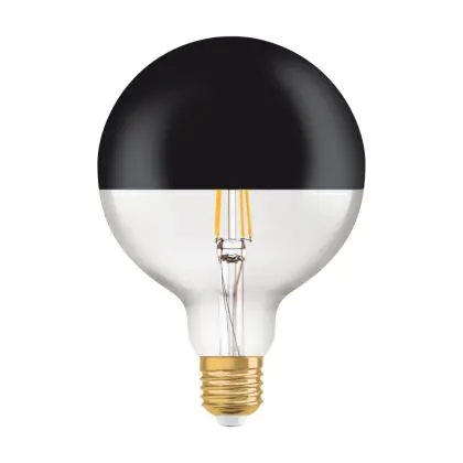 Die Osram Vintage 1906 LED E27 Globe 7W 827 Spiegel Schwarz | Ersetzt 52W ist eine moderne LED-Lampe mit Vintage-Design. Sie kann ganz einfach herkömmliche Leuchten mit einem E27-Sockel, sowie einem Verbrauch von 52 Watt ersetzen und ermöglicht damit eine Energieersparnis von bis zu 90 %. Zudem punktet die Lampe mit einer langen Lebensdauer, leuchtet in der Farbtemperatur extra Warmweiß und besitzt einen spiegelschwarzen Leuchtkörper, dessen untere Hälfte klar und die obere Hälfte schwarz ist.